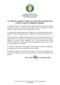 La Communauté économique des Etats de l’Afrique de l’ouest (Cedeao) est préoccupée par les allégations portées contre le Nigeria, le Bénin et d’autres Etats membres de l’organisation régionale qui seraient des parrains du terrorisme. Dans un communiqué publié le 26 décembre 2024, elle apporte son soutien aux Etats membres qui sont accusés à tort. Lire le communiqué.