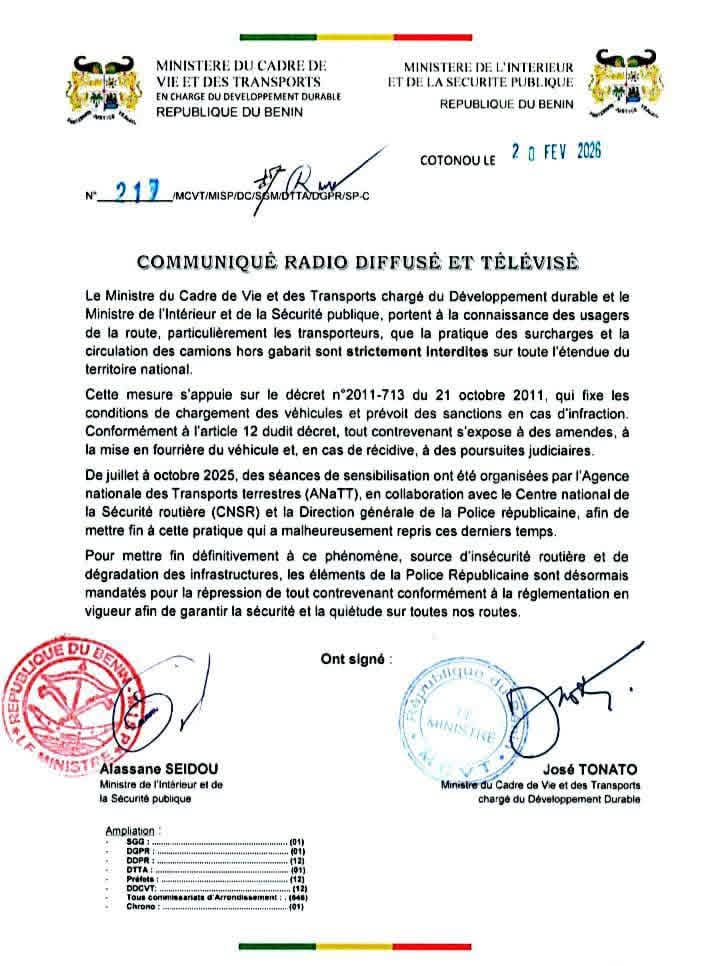 A travers un communiqué conjoint en date du 20 février 2026, le ministre en charge des Transports, José Tonato, et son collègue de l’Intérieur et de la sécurité publique, Alassane Seidou, ont rappelé aux usagers de la route, particulièrement les transporteurs, que la pratique des surcharges et la circulation des camions hors gabarit sont strictement interdites sur toute l’étendue du territoire national. Pour « mettre un terme définitif à ce phénomène, source d’insécurité routière et de dégradation des infrastructures, les éléments de la Police républicaine sont désormais instruits pour procéder à la répression systématique de tout contrevenant, conformément à la réglementation en vigueur, en vue de garantir la sécurité et la quiétude sur l’ensemble du réseau routier national », précise le communiqué dont l’intégralité est ci-dessous publiée.