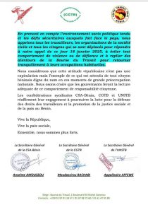 Après l’interdiction de la cérémonie d’hommage aux soldats tués lors de l’attaque meurtrière à Banikoaora, les trois Confédérations syndicales dénoncent une « décision arbitraire et injustifiée de l’autorité ». Elles l’ont fait savoir à travers une déclaration rendue publique. Voici ladite déclaration ci-dessous.
