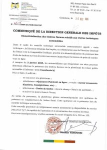 Dans un communiqué rendu public ce 30 décembre 2024, la Direction générale des impôts annonce que le paiement des timbres fiscaux pour la visite technique se fera en ligne à compter de ce jeudi 2 décembre. La procédure à suivre est détaillée dans ledit communiqué dont voici l’intégralité ci-dessous.