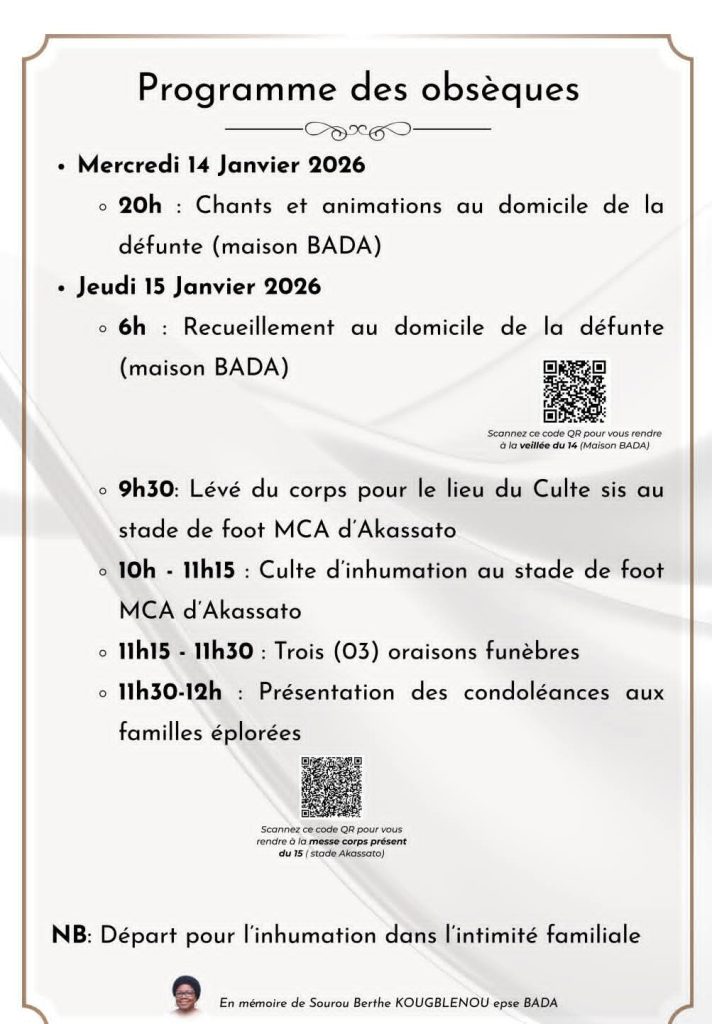 L’épouse du général Bertin Bada sera inhumée le samedi 15 janvier 2025 dans l’intimité familiale après un culte au stade de football Mca d’Akassato. Le programme des obsèques ci-dessous publié, a été rendu public par la famille.