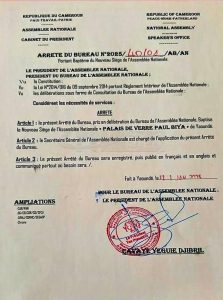 « Palais de Verre Paul Biya », c’est le nom donné au nouveau siège de l’Assemblée nationale du Cameroun par le bureau de l’institution réuni ce samedi 11 janvier sous la présidence du président Cavaye Yegue Djibril. Ci-dessous, l’arrêté du bureau.