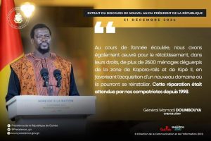 Le président de la Transition en Guinée, le Général Mamadi Doumbouya a souligné, dans son discours sur l’état de la nation, le 31 décembre 2024, le dédommagement de plus de 2500 ménages déguerpis et en attente de réparation depuis 26 ans. Ci-dessous, l’infographie du pan de sa déclaration (source : présidence Guinée).