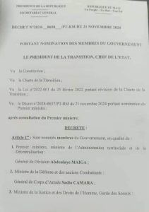 Le Mali a un nouveau gouvernement après le limogeage du premier ministre Choguel Maïga, mercredi 20 novembre et la nomination de son successeur (Général Abdoulaye Maïga) ce jeudi 21 novembre. Ci-dessous, la liste des membres du nouvel Exécutif composé de 28 membres dont 4 femmes.