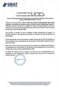 Les travaux d’aménagement des voiries primaires dans le cadre de la phase B du projet Asphaltage vont démarrer le 27 janvier 2025 à Ganhi à Cotonou. Les populations et usagers ont été informées par la Société des infrastructures routières et de l’aménagement du territoire (Sirat) via un communiqué. Durant la période des travaux, renseigne ledit communiqué, il est recommandé aux usagers d’emprunter les voies de déviation qui seront indiquées pour la circonstance par des panneaux d’informations déployés dans la zone concernée. La direction générale de la Sirat invite par la même occasion, les usagers de la route « à faire preuve de prudence et à respecter les indications des panneaux de signalisation pour leur sécurité ». En cas de besoin ou de désagréments liés aux travaux, le numéro vert 7414 est mis à disposition pour être contacté.