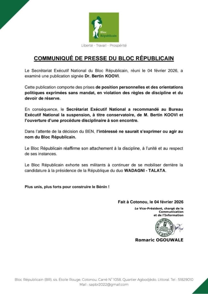 Réuni le 04 février 2026, le secrétariat exécutif du Bloc républicain a relevé que des prises de position publiques de Bertin Koovi ont été faites sans mandat, en violation des règles internes du parti. En conséquence, il a recommandé sa suspension à titre conservatoire et l’ouverture d’une procédure disciplinaire. Le Bloc républicain réaffirme son attachement à la discipline et à l’unité, et appelle ses militantes, militants et sympathisants à rester mobilisés derrière la candidature du duo présidentiel Wadagni–Talata pour un Bénin stable et prospère. Lire le communiqué annonçant la sanction.