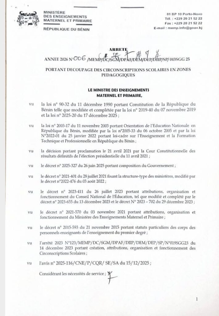 Le système éducatif béninois franchit une nouvelle étape dans sa réforme structurelle. Le Ministère des enseignements maternel et primaire (Memp) a procédé au redécoupage des circonscriptions scolaires en zones pédagogiques, portant désormais leur nombre à 118 circonscriptions scolaires et 344 zones pédagogiques sur l’ensemble du territoire national.