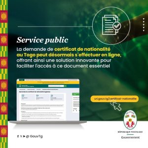 Au Togo, la demande de retrait du certificat de nationalité peut se faire dorénavant en ligne via le portail du service public de l’administration à l’adresse https://service-public.gouv.tg/. L’annonce a été faite par le gouvernement le vendredi 13 décembre 2024 à travers un post sur ses canaux.